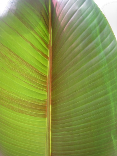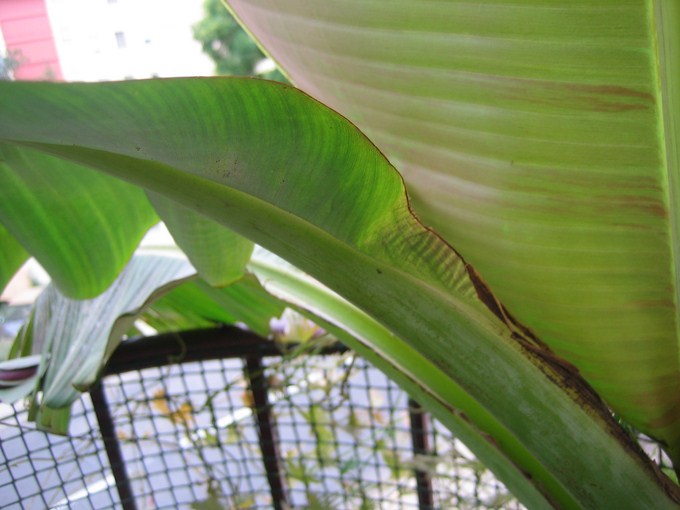 Je possède un pied entièrement vert : il n'a jamais eu de marbrure, même sur les rejets. Par contre le revers de la feuille est rosé (et non irrégulièrement pourpre comme chez certains basjoos). Ce pied offert par Michel Bourbier provient des premiers pieds introduit dans les années 90 en Angleterre.