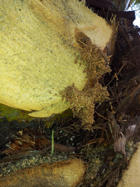 Entre les folioles lorsque le stipe n'est pas nettoyé il y a du chanvre qui retient l'humidité et parfois des petites plantes peuvent germer. Cela leur fournit probablement de quoi se nourrir.