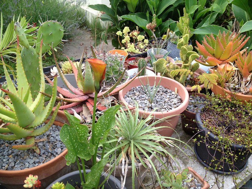 Sur "la table à bordel", est-ce un dasylirion ou un puya que l'on aperçoit ? Il peut aller en pleine terre dans le premier cas. Et dans le second, à voir lequel est-ce mais ça peut être envisageable aussi