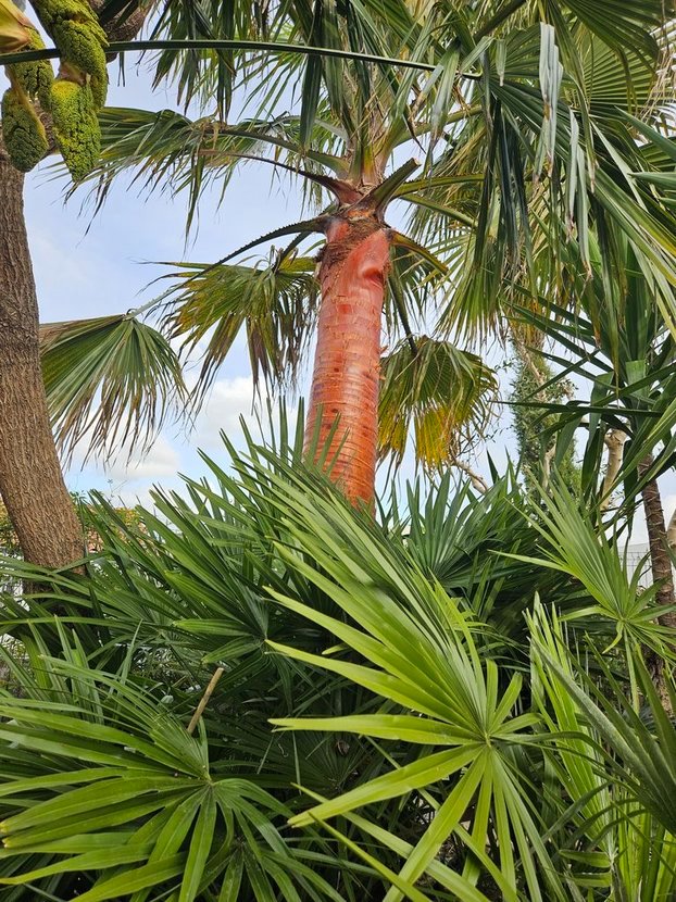 Le trachy a subi une taille un peu drastique car une partie de son stipe était complètement pourri en partie haute, et je n'ai pas eu le choix que d'enlever 2 couronnes supplémentaires qui sont parties d'un coup.... Je pensais à une attaque de ce satané coléoptère car deux palmes sorties en hivers étaient complètement difformes (il manquait la moitié du bout des palmes), mais finalement je ne pense pas, les nouvelles sont ultra saines... Il y avait vers de terre, humus, etc... Cela fait une cicatrice. :(
