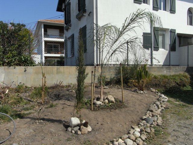 Mon idée est d'une part d'habiller la souche de lorsque les palmiers auront grandis et d'autre part d'éclairé par son feuillage ce coin sombre et sec.