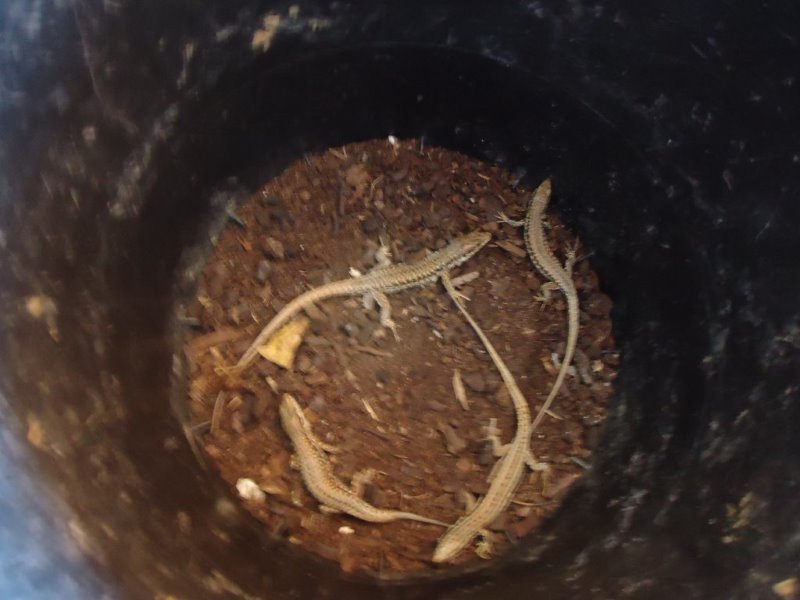 En laissant ce pot à terreau presque vide près d'un tas de bois de chauffage couvert , je ne m'attendais pas à voir ces 4 lézards tomber dedans..