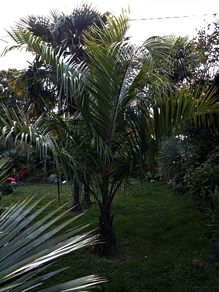 Je voulais vous montrer un de mes butiagrus en photo, cette année il a bien profité des conditions favorables des derniers hivers. Je trouve que c'est un palmiers qui gagne à être planté pour plusieurs raisons. Une qualité première est tout simplement son élégance, il est bien vert et fourni là ou d'autres seront jaunes et rachitiques... Une autre qualité est sa résistance au froid qui doit être voisine de celle de sa mère Butia, ce qui permet de le planter dans beaucoup de coin de France. On lui trouve aussi une certaine rapidité de croissance, moi je dirais plutôt qu'il est un peu moins lent que d'autres. Une dernière qualité est sa rareté qui permettra à coup sûr de ne pas avoir le même trachycarpus que son voisin!