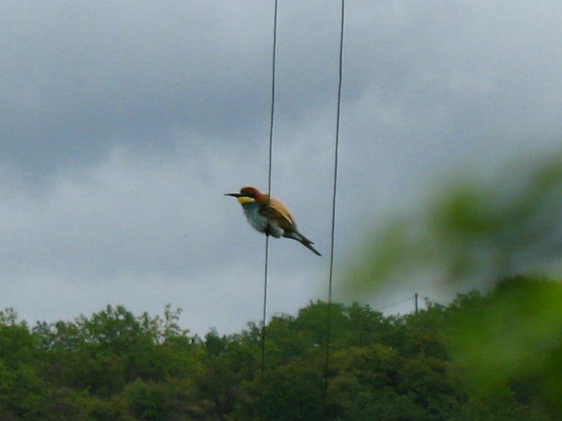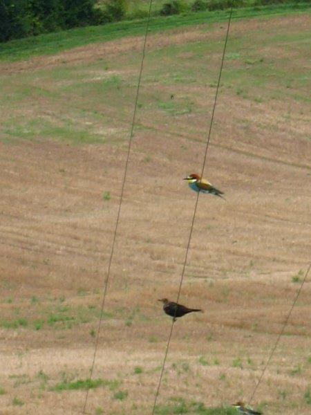 Ce matin j'ai pu assister juste devant la maison à un vol de guêpiers qui tournoyaient et se posaient sur les fils.