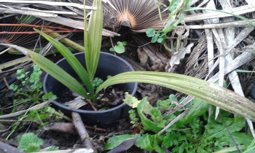 Sabal étonia à passé l'hiver en pot dans le fond du jardin exposition Nord mais soleil d'est-ouest tout la journée