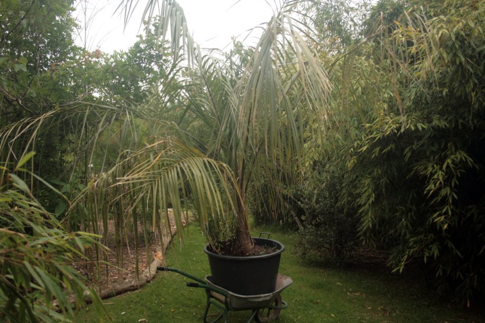 Une plantation , parajubaea torallyi , acheté tout petit il y a 5/6 ans , les anciennes palmes sechaient cette année , il avais rempli a craquer sont contenant :shock: