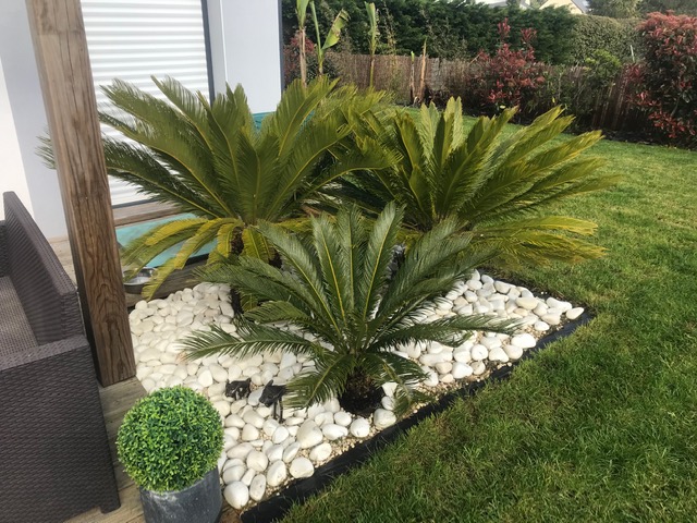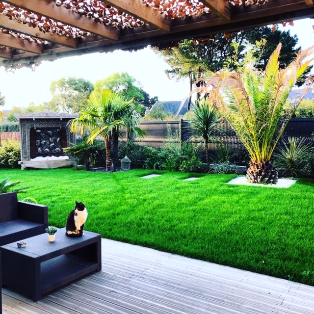 je suis arrivé, il n'y avait presque rien, maison neuve de 2018, j'ai réalisé ce jardin en une semaine, le gazon est un gazon naturel en rouleaux