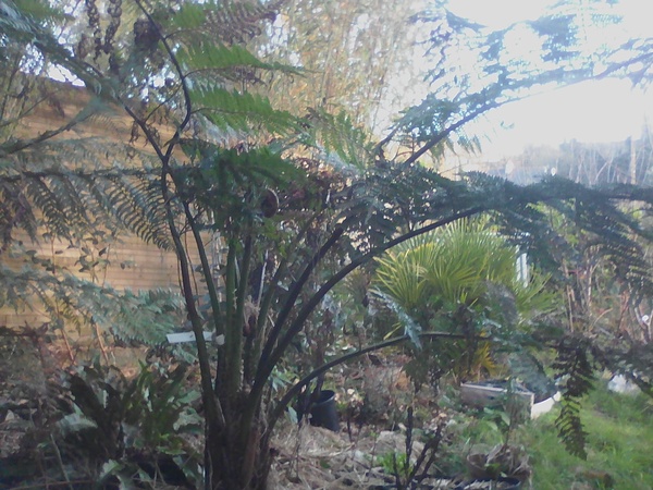 Mes fougères ont eu quelques feuilles bruler par les gels , les nouvelles crosses se développent bien !La Cyathea australis à droite des phyllostachys sur la photo, n'a pas broncher du tout et pousse toujours je l'adore