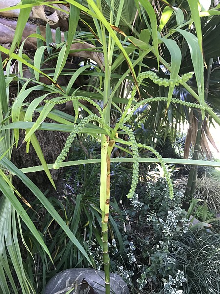 Rhapis excelsa variegata Chamaedorea vendu pour radicalis. C'est peut-être plutôt radicalis x microspadix, ou l'inverse (il ne rejette pas et fait des inflorescences plus grandes que celles du microspadix pur) : Sa fleur :