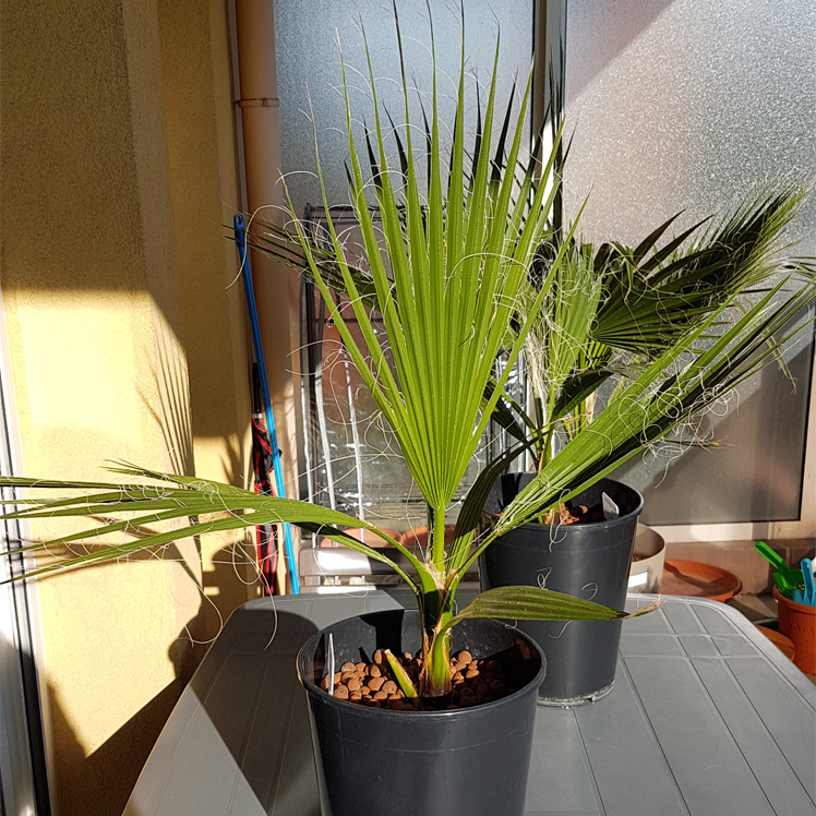 Sous un autre angle, et au soleil, voici à quoi mes deux petits Washingtonia ressemblent.
