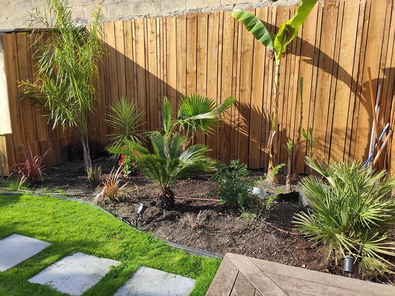 Les washingtonias sont peut être un poil trop près de votre clôture pour quand ils vont prendre de l'ampleur, j'aurais échangé de place avec le cycas.