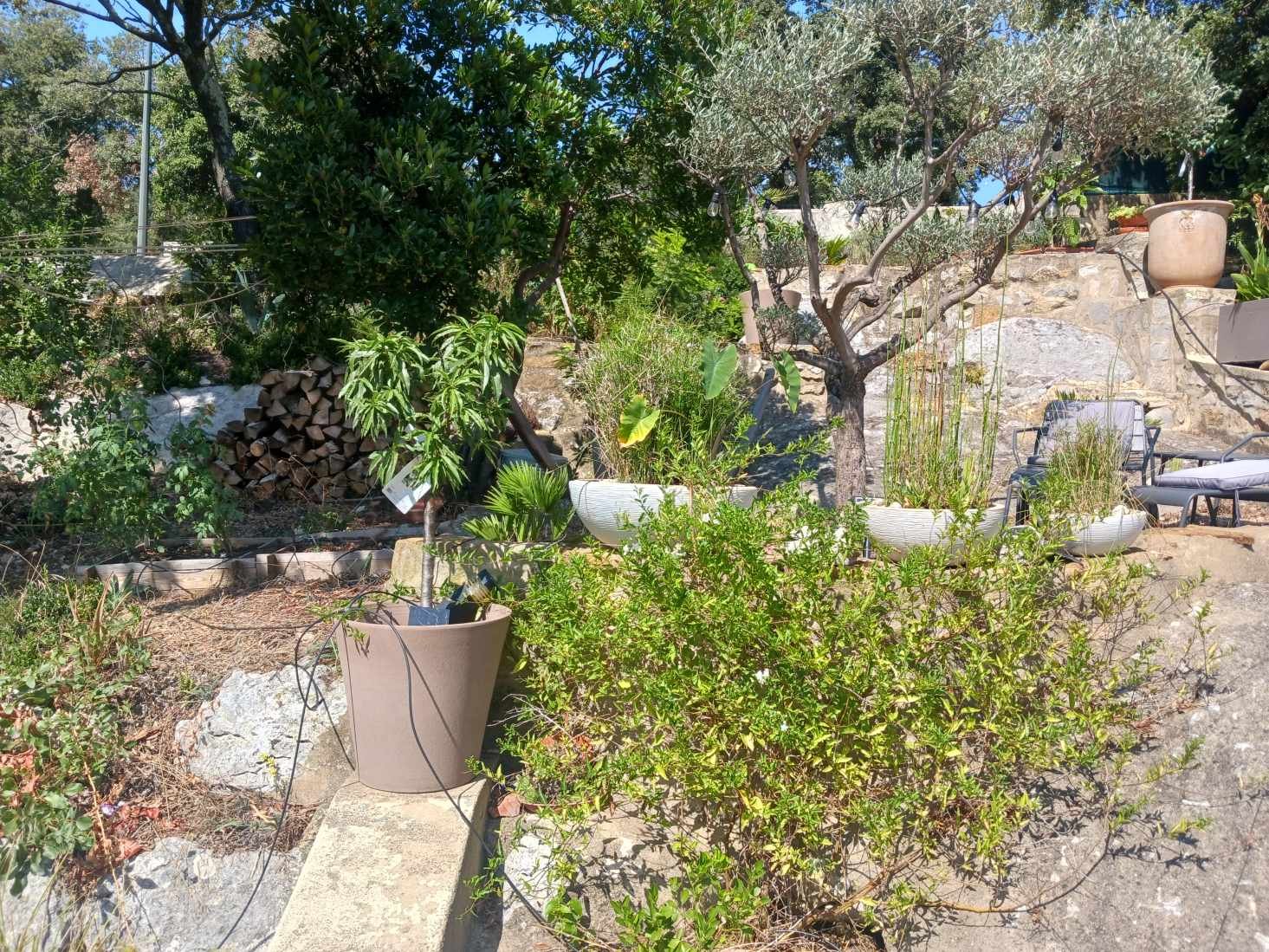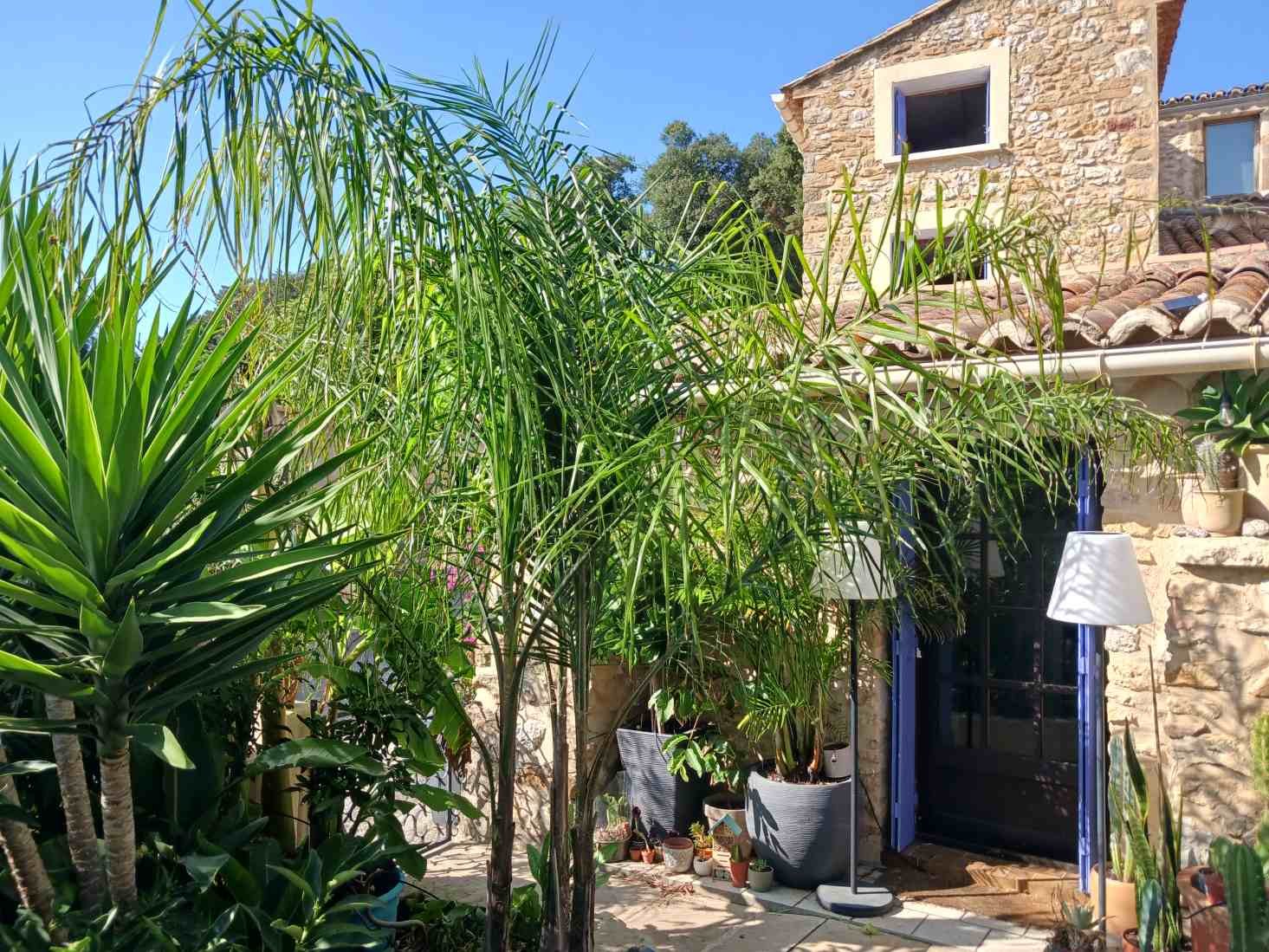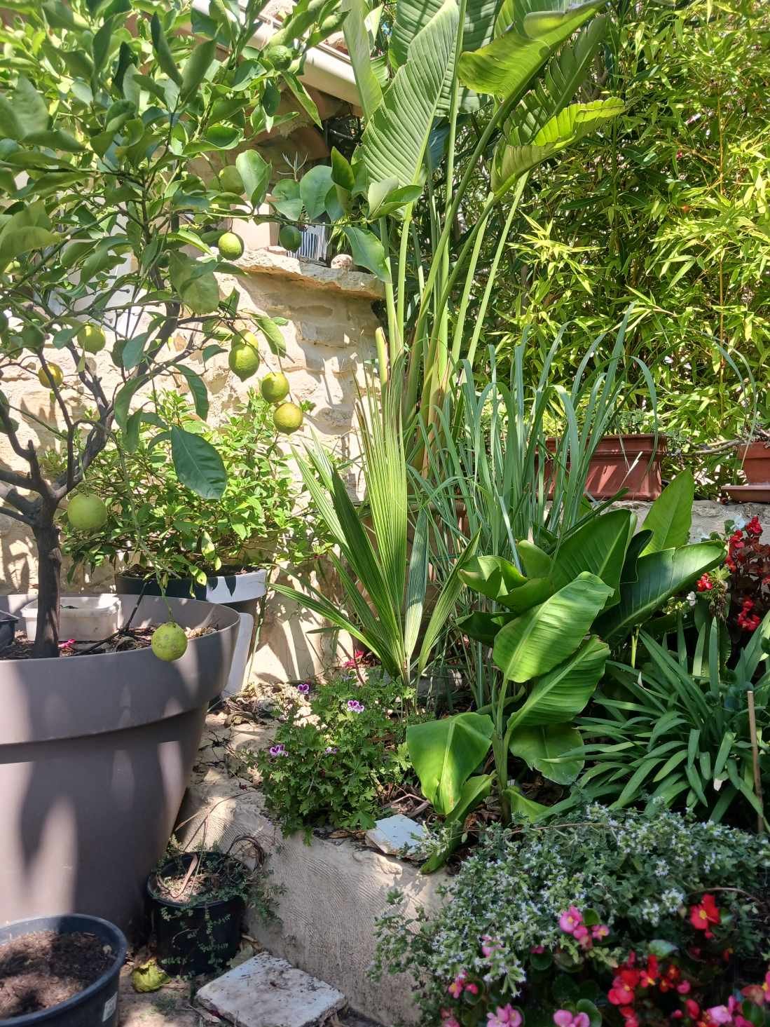 Jolie maison avec ce jardin en terrasse tu as un sacré potentiel, et une belle petite collection de plantes! Pour le dactylifera ça peut peut être passer dans le bac le stipe final doit faire 50cm de diamètre il est bien plus petit que canariensis.