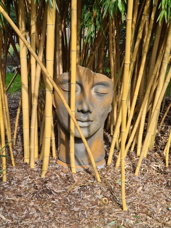 D'habitude je n'aime pas trop les sculptures ou les grigris plantés au milieux des exotiques pour faire "ambiance" mais j'avoue que ton visage aux traits fins et qui a l'air de qualité, s'intègre très bien dans tes bambous..