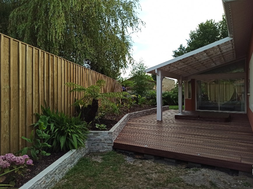 Il n'y a que le plaquage en pierres grises bien régulières sur le muret qui à mon sens dénote un peu et multiplie les matériaux dans une ambiance où l'unité était assez réussie avec la prédominance du bois.