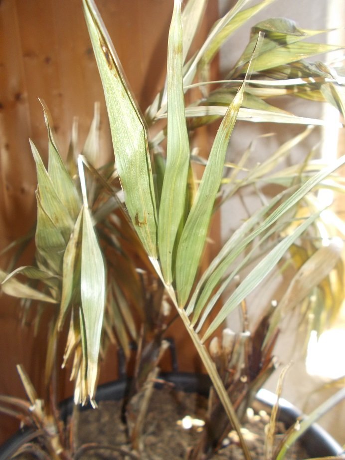 J'ai un petit palmier en pot. Avant il était à l'intérieur et se portait très bien. Mais je l'ai rempoté il y a deux ans et mis à l'extérieur, et depuis il se porte beaucoup moins bien. Depuis l'hiver dernier, les palmes se décolorent, deviennent brunes, sèches et tombent. Je me demande si c'est à cause de l'hiver ou s'il y a une carence ? j'ai mis de la terre de jardin. Depuis quelques temps, je l'ai rentré à nouveau mais il ne redémarre pas, au contraire.