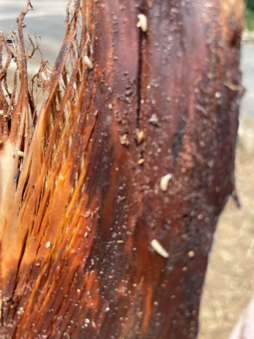 Suite de la maladie (et de la mort) du butia : sur la photo jointe on voit des petits verts qui sont collés au coeur du palmier qui est maintenant pourri et que j'ai extrait. Ce sont des larves de quoi ? Charançons ?