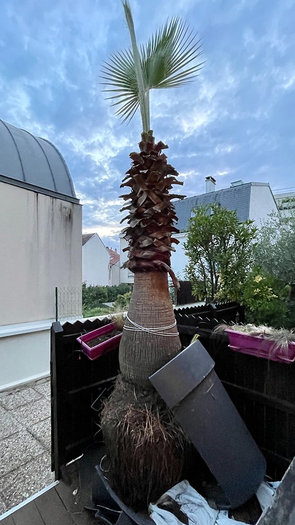 Pour le transport, on a essayé d'enlever le pot et tailler qqe palmes pour libérer du poids et de la place mais ce n'était pas assez.