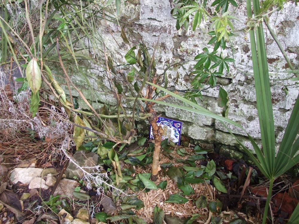 une zone abritée par une viorne ancienne et un oranger du mexique, accolée à un mur sud ouest, près de la maison et de la dalle de la terrasse.