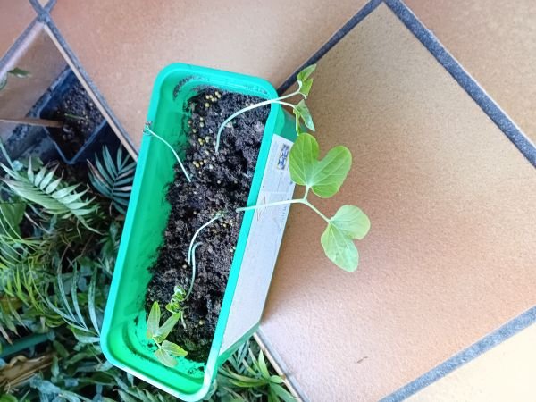 Je poste une nouvelle photo, entretemps le développement de trois graines survivantes semble donner raison au pronostic de Fredlejardinier qui osait avancer l'option "plante grimpante".