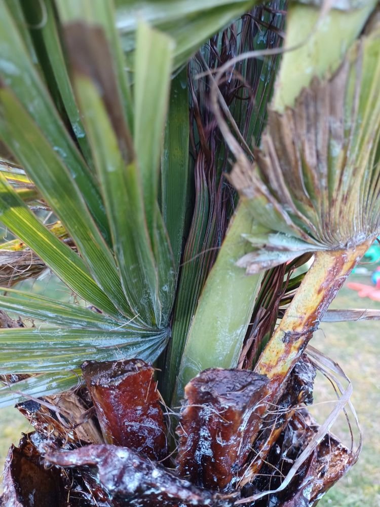 Bonjour, vous habitez où ? Et votre protection était fait comment ? Et surtout est ce que les parties foncé sur le ''stip'' 😉 est visceux ? Car si c'est visceux y a probablement du charançon et paysandisia devant. A voir si vous avez des trous sur le stip. 😉