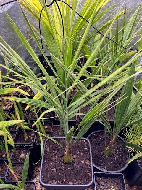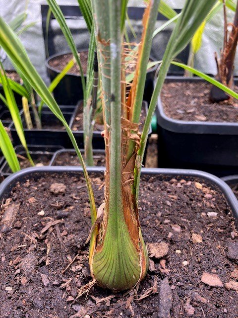 Voici une photo de la mère de tes petits prise l’été dernier. Sa croissance est assez phénoménale…et je pense que c’est mon palmier préféré. Il n’a absolument pas bronché à la tempête Ciaran de l’année dernière : pas une feuille cassée, pas de feuillage brûlé, alors qu’on a eu jusqu’à 160 km/h.