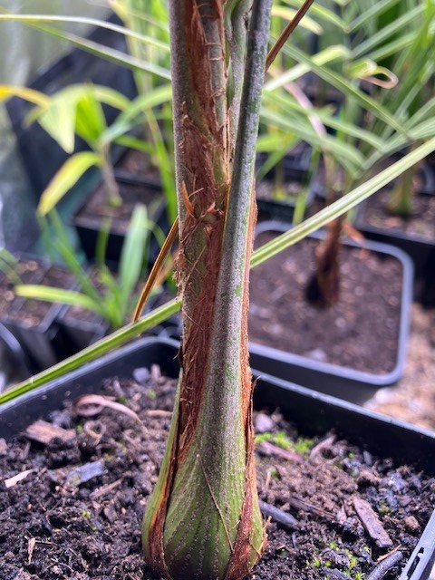 Voici une photo de la mère de tes petits prise l’été dernier. Sa croissance est assez phénoménale…et je pense que c’est mon palmier préféré. Il n’a absolument pas bronché à la tempête Ciaran de l’année dernière : pas une feuille cassée, pas de feuillage brûlé, alors qu’on a eu jusqu’à 160 km/h.