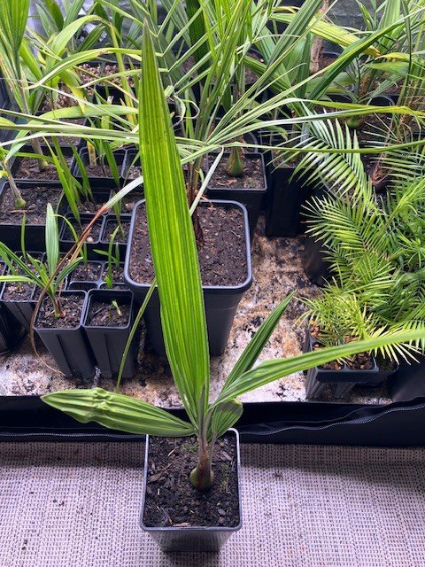 Voici une photo de la mère de tes petits prise l’été dernier. Sa croissance est assez phénoménale…et je pense que c’est mon palmier préféré. Il n’a absolument pas bronché à la tempête Ciaran de l’année dernière : pas une feuille cassée, pas de feuillage brûlé, alors qu’on a eu jusqu’à 160 km/h.