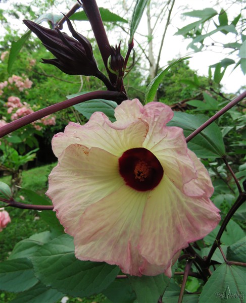 Bonjour à tous et merci à Benoît et Weevil! Voici une petite parenthèse: bientôt la Noël et aux Antilles c'est la tradition de préparer le sirop de groseilles. Il s'agit en réalité d'un hibiscus (Hibiscus sabdariffa) dont on extrait le calice et après avoir retiré le fruit en formation et récupéré les sépales,on fait bouillir ces dernières dans de l'eau avec du sucre. Il y a plusieurs variétés de cet hibiscus qui se distinguent par la couleur des fleurs et des sépales et la forme des feuilles. La plus courante est celle que j'ai dans mon jardin et qui donne un sirop très coloré.