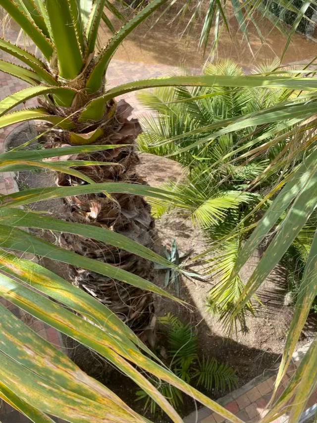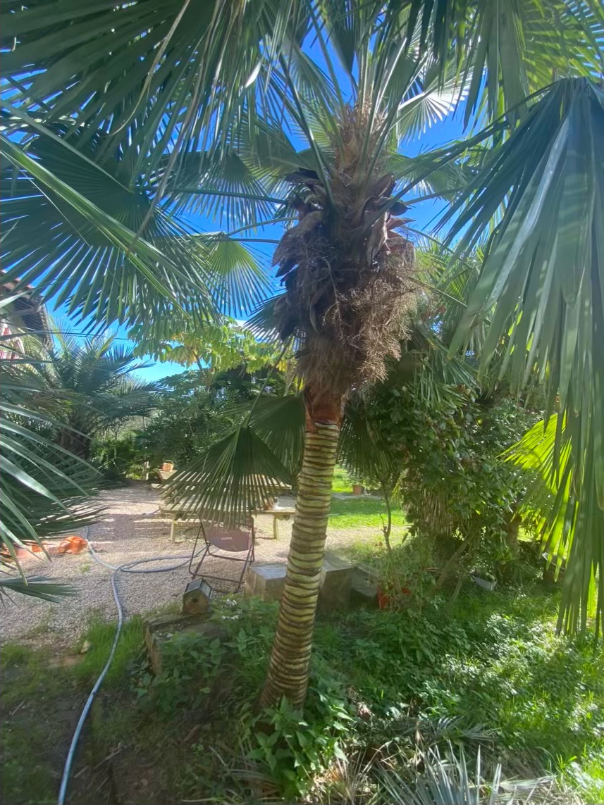 Le washingtonia filifera qui devrait plus tarder à fleurir et à côté un jubaea qui prend son temps