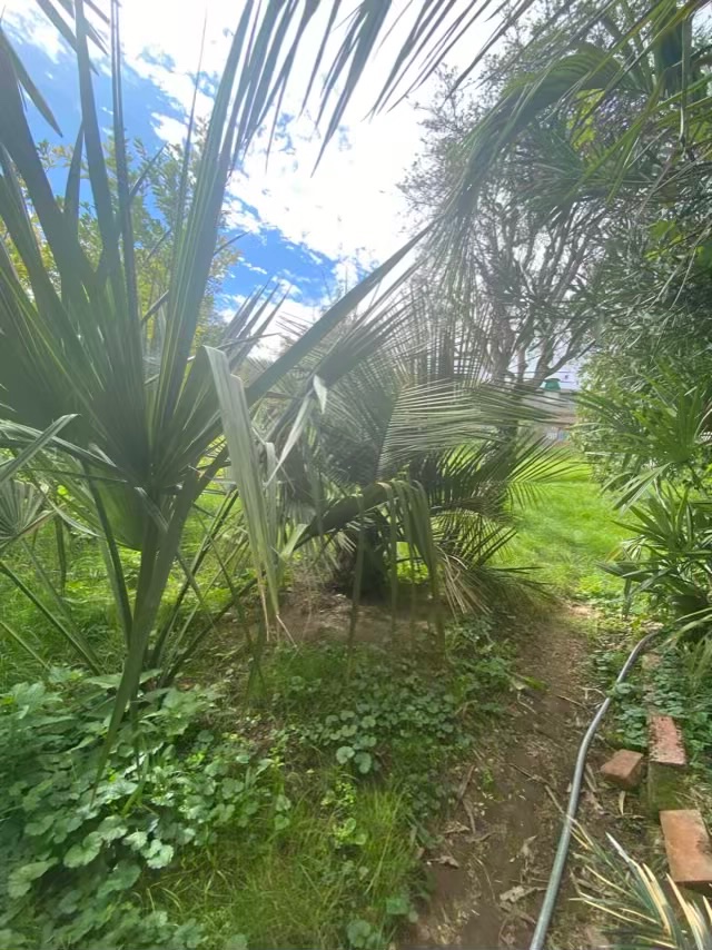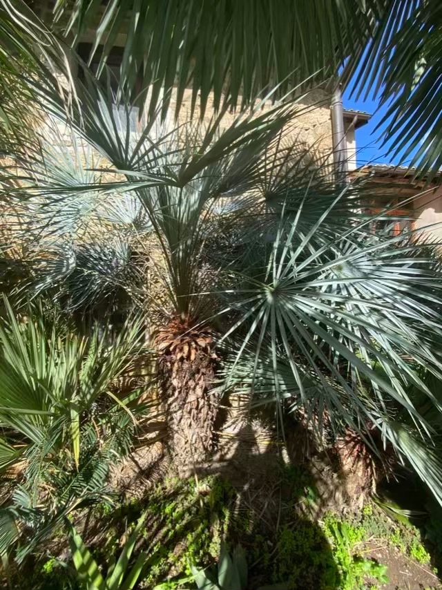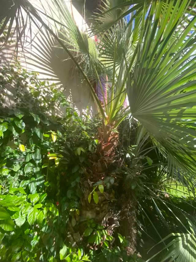 Un washingtonia filifera un peu étouffé par un trachycarpus princeps