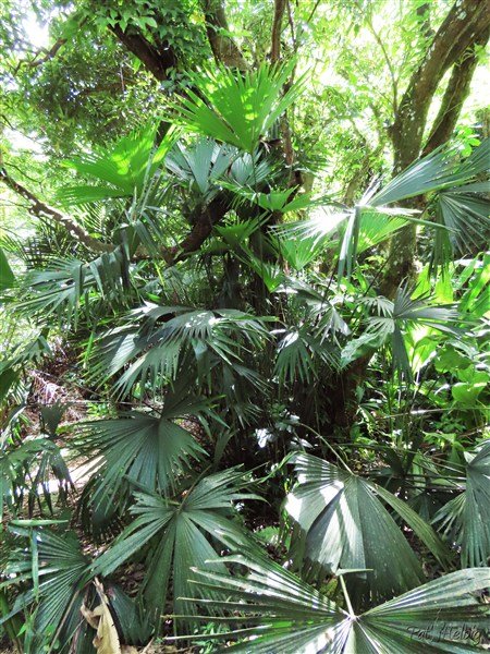 Superbes ces revers de palmes de Kerriodoxa elegans, nos Tracycarpus princeps feraient presque pâle figure à côté. L'Aïphanes en jette !
