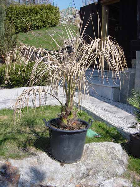 - phoenix canariensis. a passé l hivers avec protection isolation + guirlande lumineuse + cable chauffant. pratiquement intacte