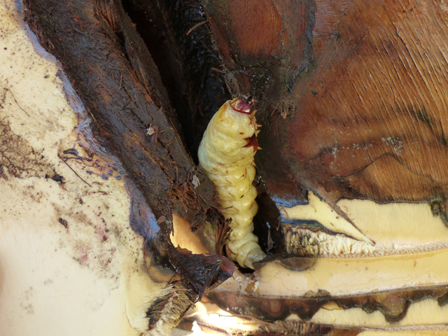 Larve bien grasse!!! J'ai bien entendu traité cette après-midi l'ensemble de mes palmiers.