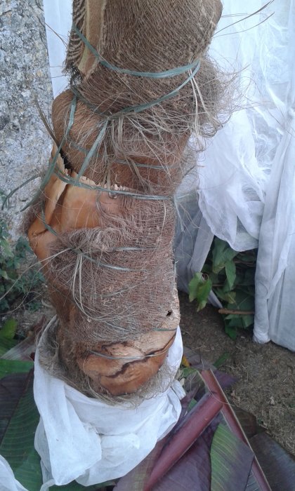 Bonjour,nous n'avons toujours pas eu d'eau depuis juillet,ou si peut,les terres sont sèches et le froid semble arriver tranquillement,les températures baissent de façon significative,du coup ,j'en profite pour emballer l'ensète,le manque d'eau rend son feuillage cassant et plus vraiment joli,alors aujourd'hui j'ai coupé,et protégé pour l'hiver mon Ensètecarpus Maurelli