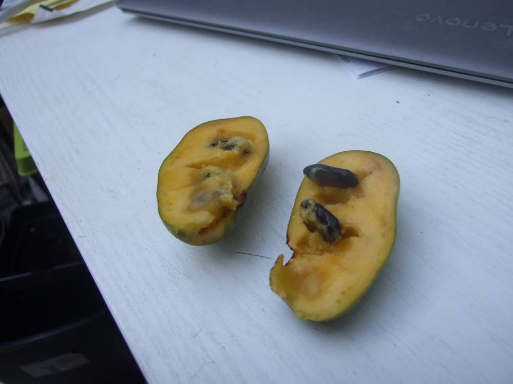 Je suis hier allé me promener dans un des parcs de la ville, qui contient un petit jardin botanique, et celui-ci possède un asiminier ( le type n'est pas spécifié) d'un bel âge, et d'environ 6 ou 7m de haut qui avait sur ses branches environ 20 fruits ! J'ai craqué j'en ai pris deux, mais ils m'ont l'air de manquer de maturité..