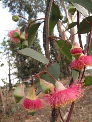 La plupart des Eucalyptus du groupe leucoxylon sont aussi en fleur, voici mon E.petiolaris qui a les fleurs les plus rouges.