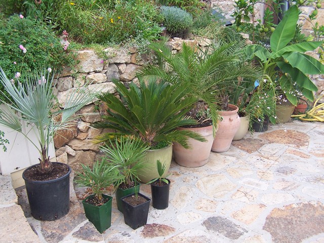 Butia planté ce printemps, ses voisins trop encombrant seront déplacés l'an prochainTrachys plantés en novembre 2011 avant la VDFbébé wash flifera semis 01/03/2012 et Largestroemia de récup sur un chantier, transplanté ce printemps