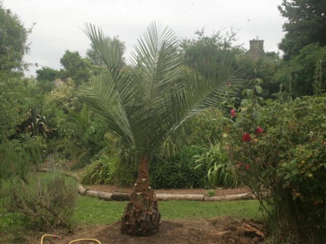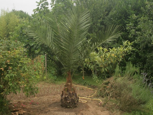 Et hop!! Le voilà planté et arrosé .Maintenant ,bébé jubaea tu peut te détendre , finis les voyages...Je te détache meme les palmes par cette journée nuageuse.