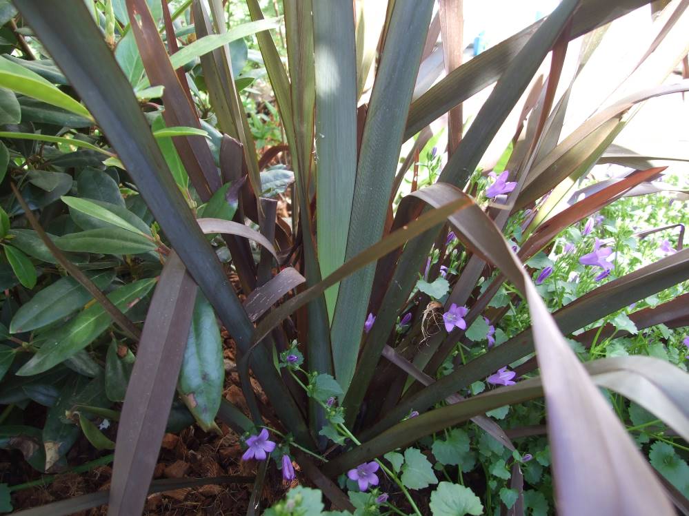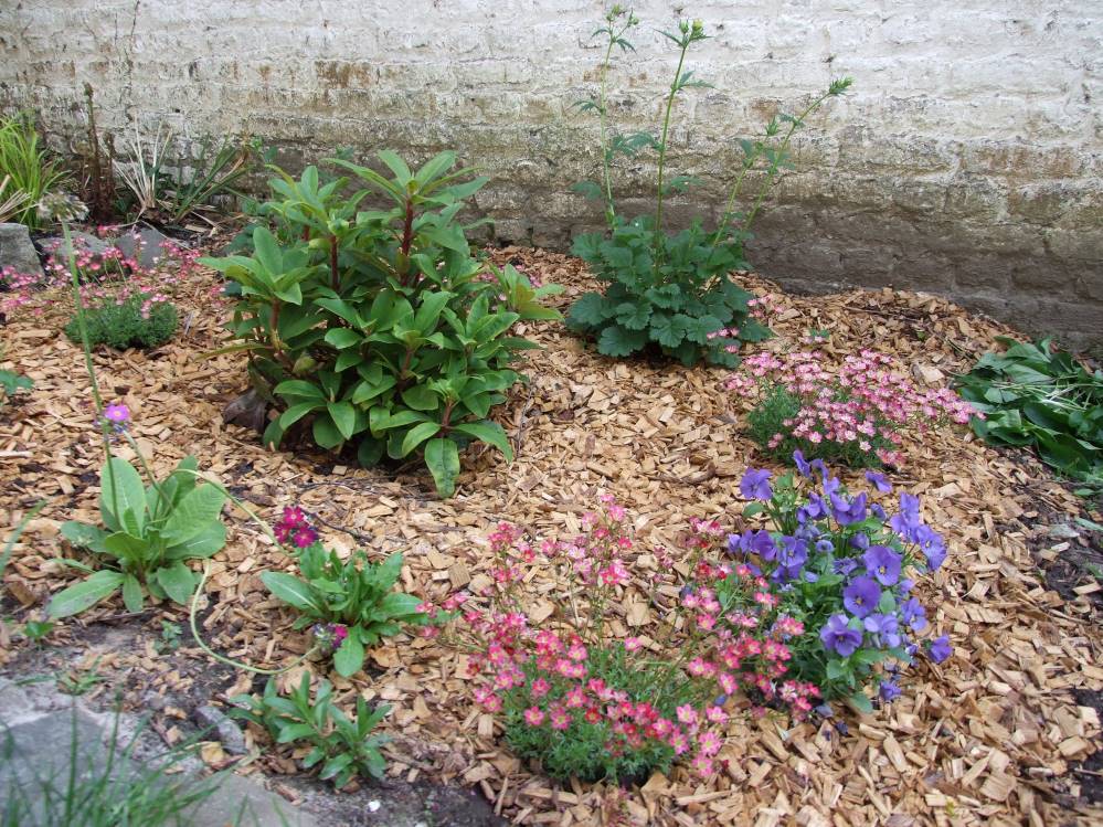 Juste au dessus du bassin disparu, l'espace a été colonisé cet hiver par du muflier qu'on annonçait comme rustique seulement jusqu'à -5°, il est maintenant en train de s'étendre en direction des campanules..