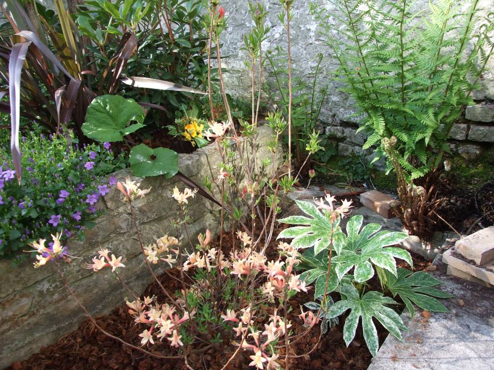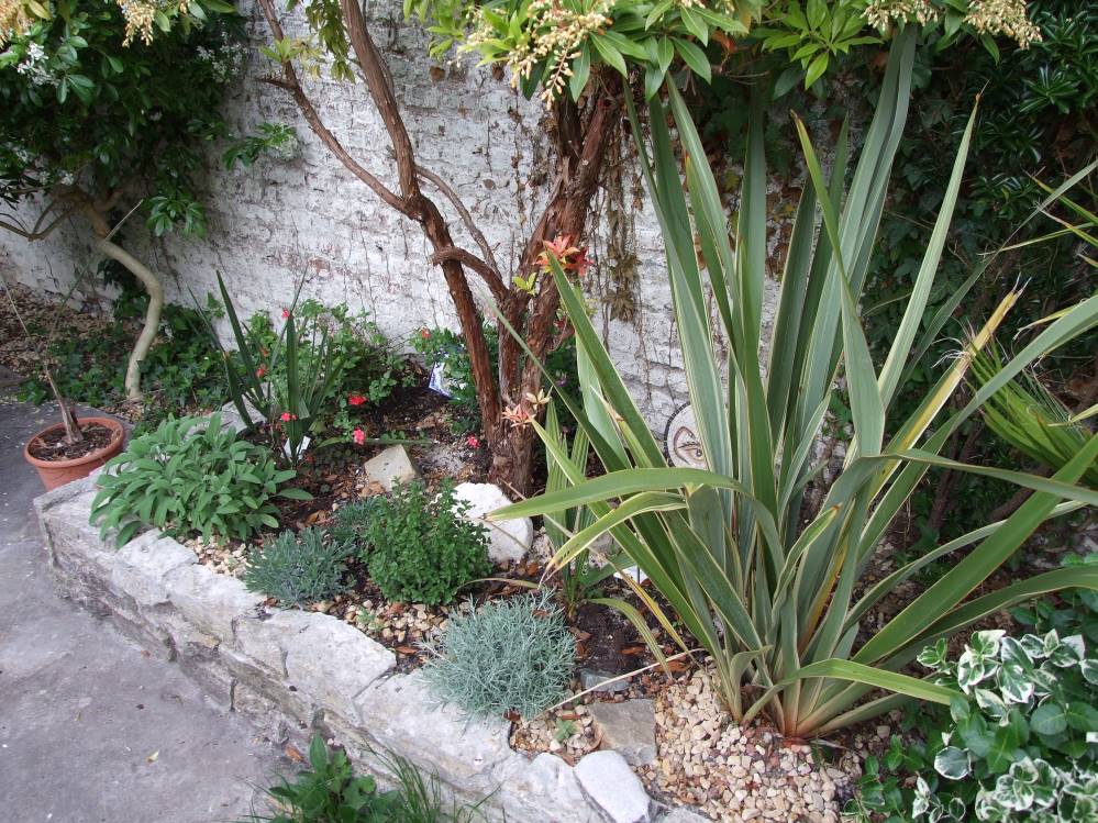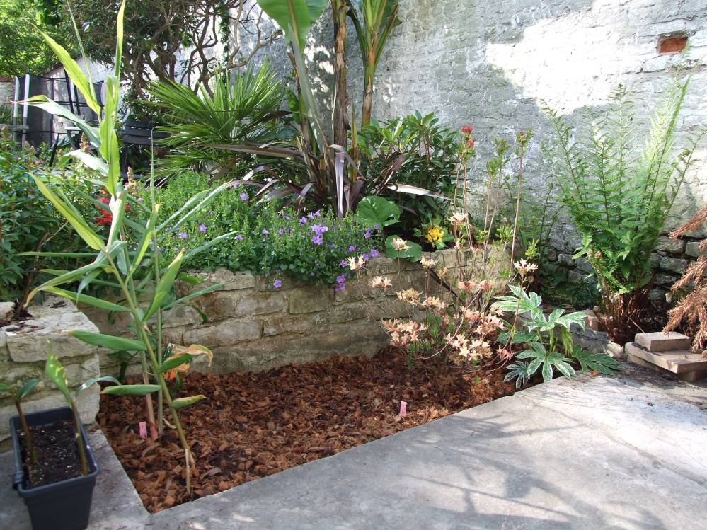 Juste pour ajouter, l'espace à l'entrée du jardin qui proposait un bassin, je l'ai rempli de terre pour y mettre des plantes vivaces, et rhizomateuses subtropicales.. ( et puis pour éviter les moustiques en été)..