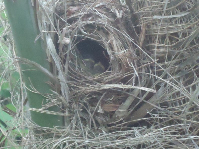 Voilà enfin habité de 5 ou 6 petits Troglodytes , le nid tellement bien fait à la base d'une palme de mon butia odorata de 15 ans .Photo un peu floue , mais on aperçoit quand même 2 têtes .....