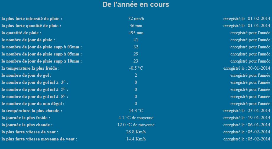 C'est en effet le point faible de mon site, le vent n'est enregistré que tout les 15 moins, pour ne pas surcharger ma base de donnees, je passe donc à côté de raffales importantes. Maintenant, ma station enregistre bien les mini/maxi, elle a enregistrée qu'un max de 52km/h. Ceci s'explique par une situation plus abrite dans les terres (je suis loin de la côte) et que le Morbihan a été moins touché. :wink: