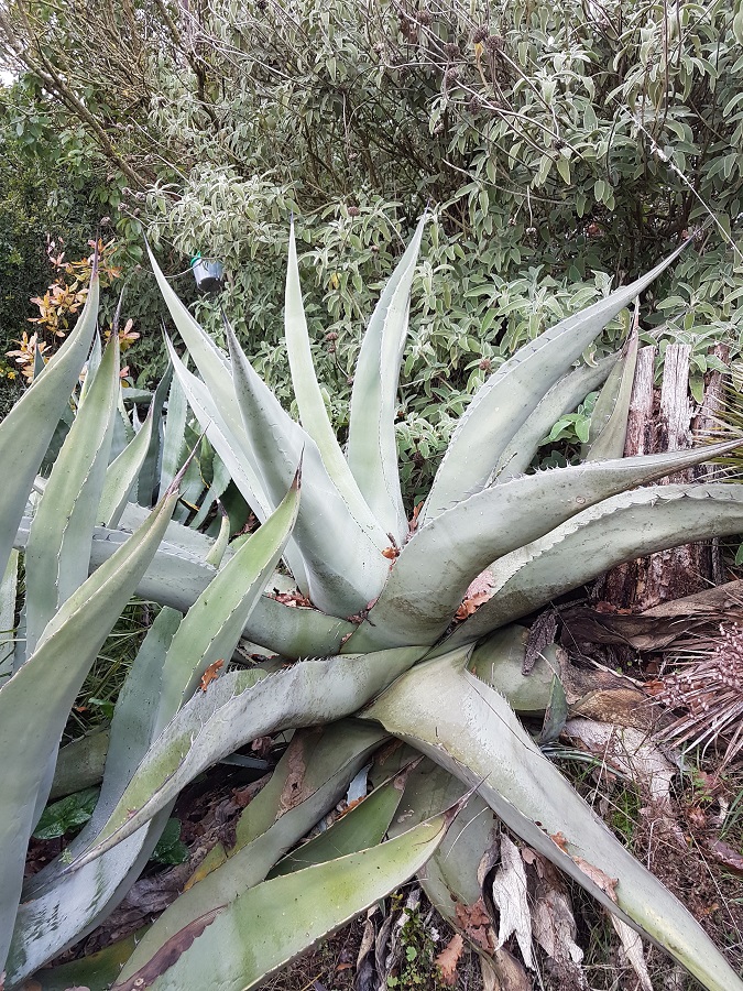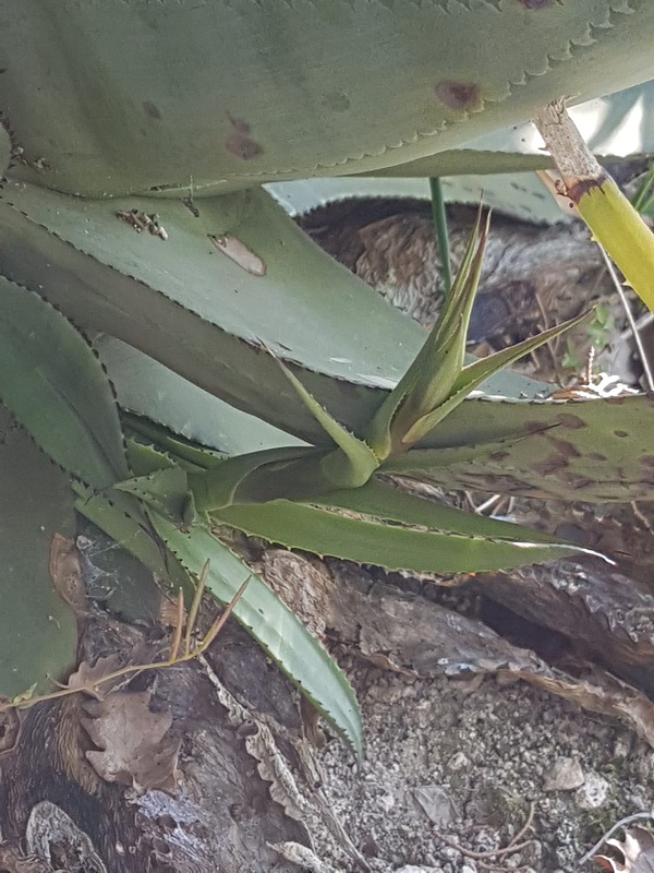 en faisant un petit tour du jardin, j'ai l'impression que mon Agave scabra planté en 1991 prépare sa floraison; les feuilles du centre sortent plus petites, je crois que c'est le début de la fin...