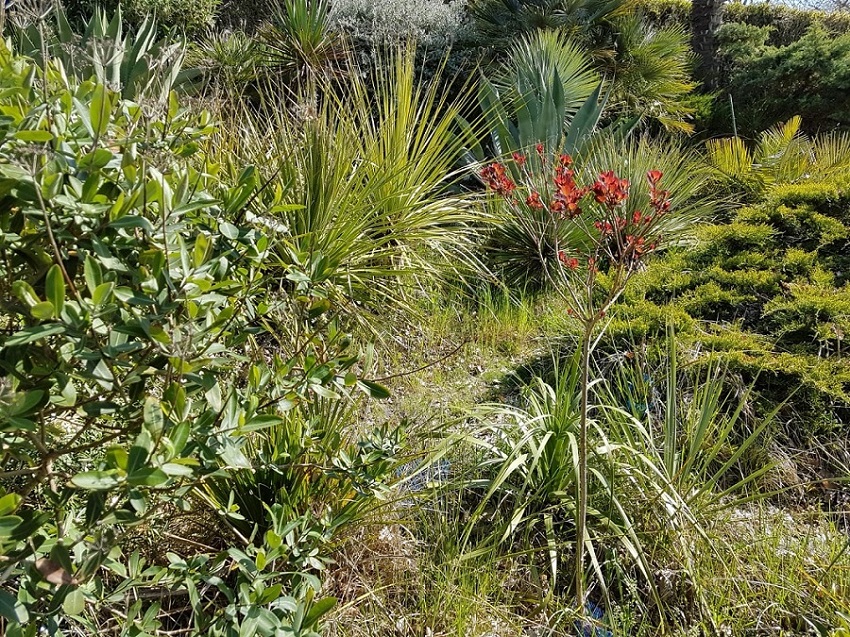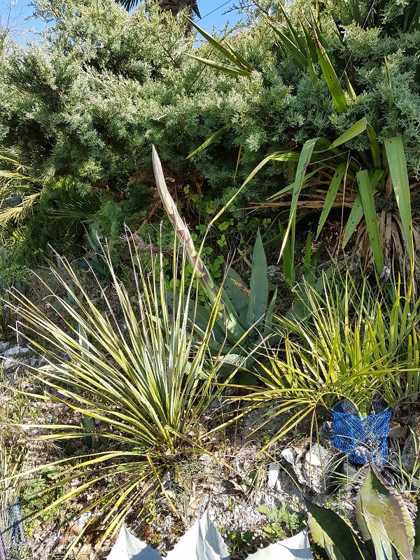 Quelques photos prises pendant ce beau we! Une agave monte à fleur, A. obscura, avec la curiosité de voir un rejet fleurir aussi.