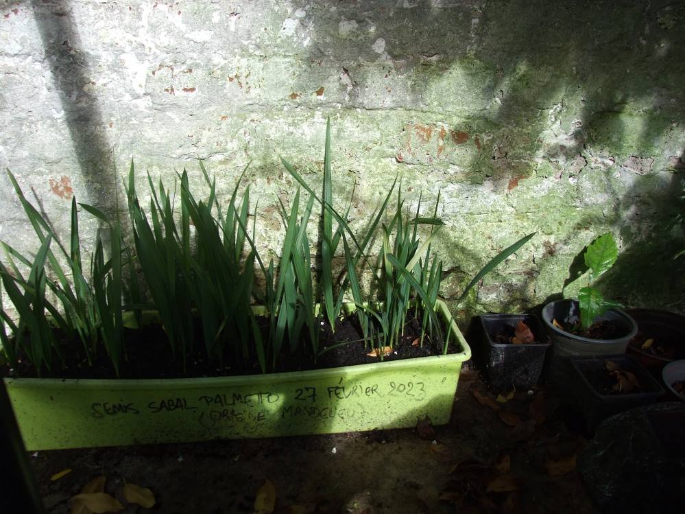 Si tu parles bien de la jardinière jaune verte contre le mur ( je pensais qu'on arrivait à lire l'écriture dessus) ce sont des plantules de sabal palmettos, récoltées en graines et plantées en février de l'année dernière à Cannes.
