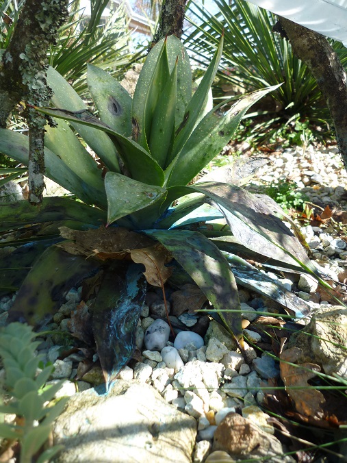 Bertrand, c'est bien un agave celsii que j'ai planté au printemps dernier. Je l'ai mis sous cloche un peu (trop) tard, je me suis laisser emporter par la douceur des températures et sous estimer les méfaits de l'eau...
