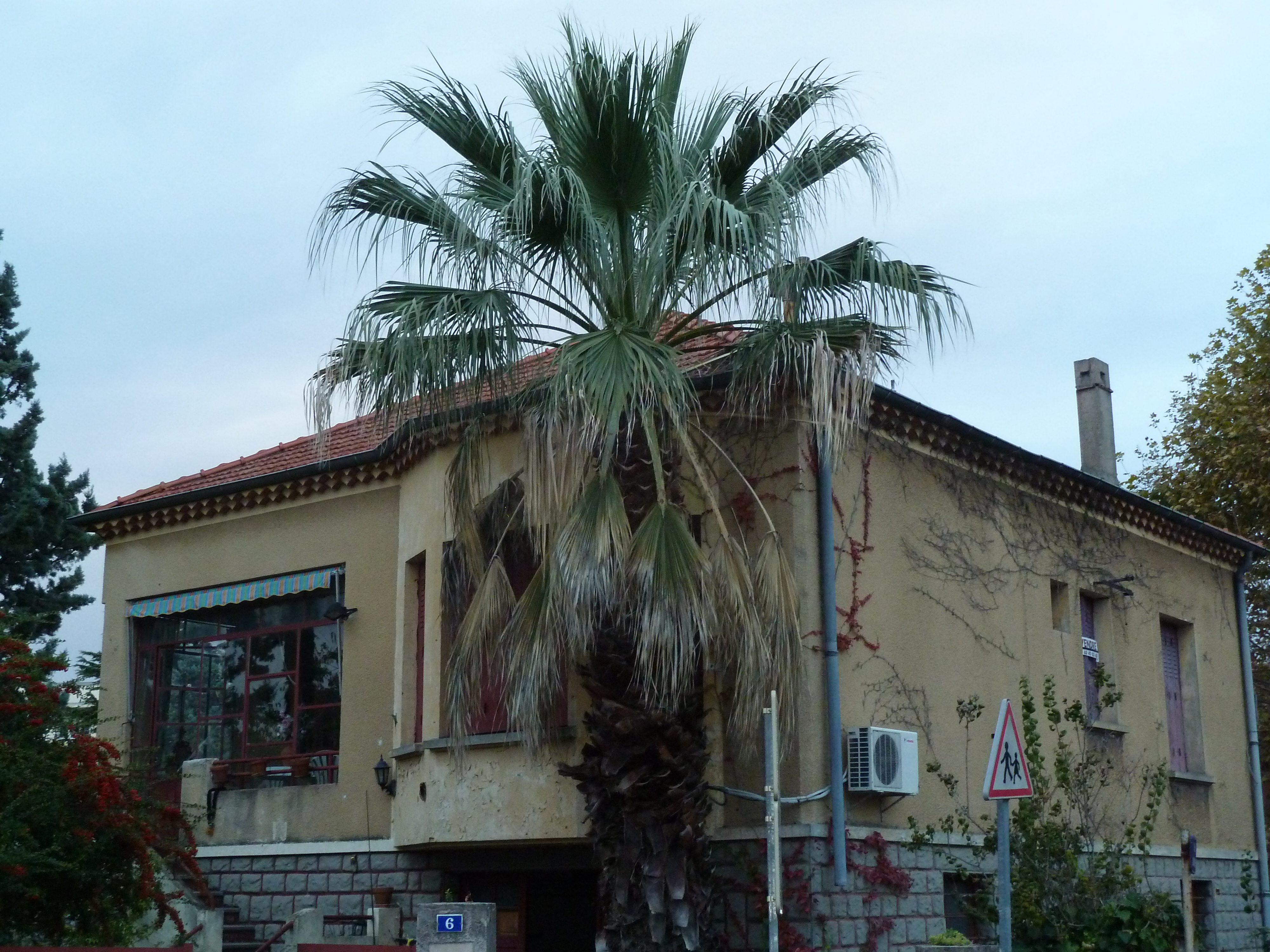 Voici un des seuls survivants de la région de Montélimar, les autres que je connaissais sont morts car situés en plein vent! la maison ici est à vendre et il y a des chances qu'un promoteur achète et construise un immeuble auquel cas le palmier serait détruit! a ceux qui habitent le coin profitez en! ce palmier a déja fleuri les années précédentes.