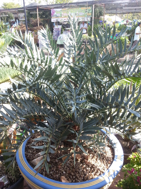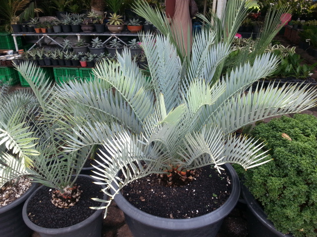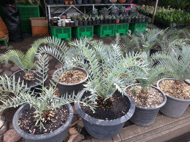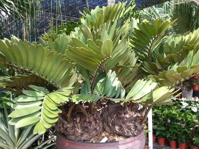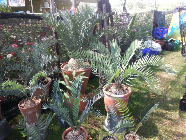 Pas mal de cycas, et surtout d'encephalartos étaient en vente. Et puis, mais là je prêche pour ma paroisse, de très beaux zamia furfuracea variegata. Les plants les moins chers, d'environ 2 ans, valaient 20 000 baths, soit environ 500 euros. Un pied femelle, magnifique, était en vente pour 150 000 baths, soit environ 4000 euros. Cela peut paraitre cher, mais ces plants étaient bien établis ( il faut compter plus de 200 euros pour un semi, quand on en trouve!!!)