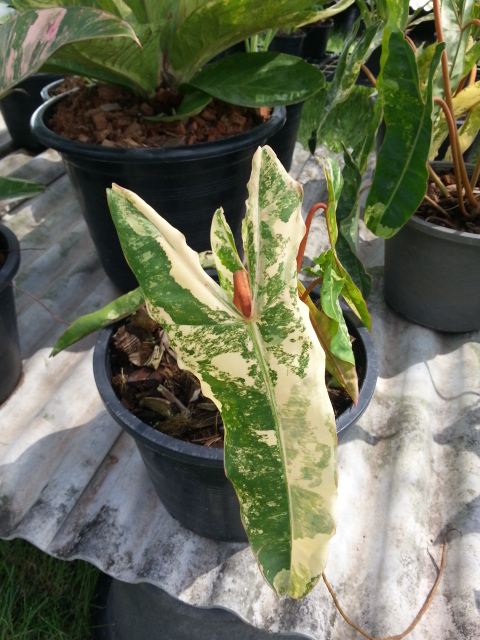 Et puis, beaucoup d'aracées, anthurium et philo. Surtout le tout nouveau philodendron billietiae variegata pour lequel il fallait compter 400 euros pour une bouture enracinée. Les prix devraient être plus abordables l'année prochaine, ce cultivar arrivant sur le marché cette année. Enfin énormément d'anthurium à feuilles panachées.... exceptionnels!!!!!