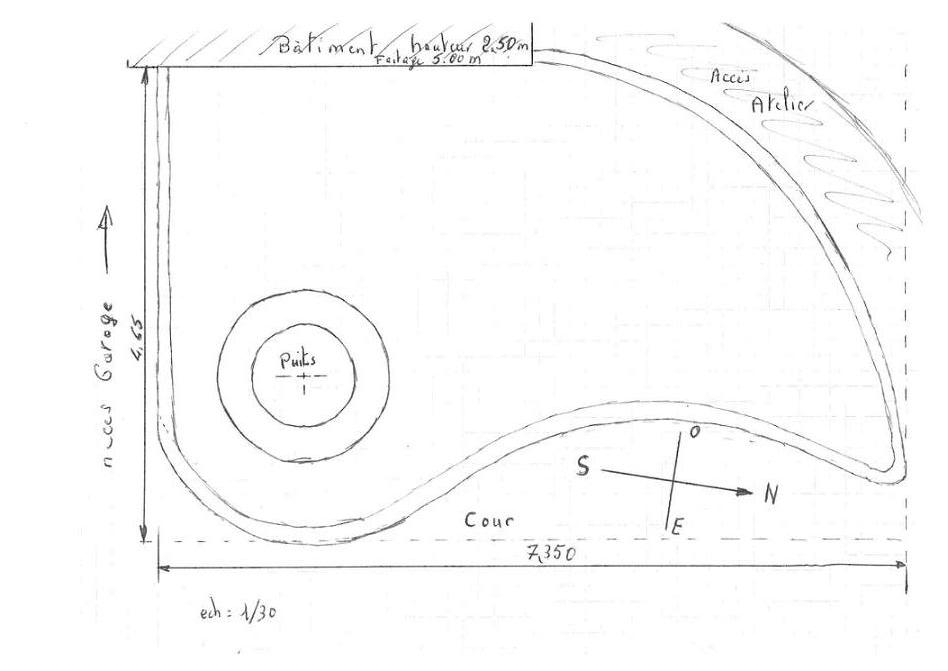 je dispose d'un emplacement d'environ 7,35 m x 4,65 m exposé au sud sur sa largeur et abrité de louest sur la moitié de la longueur par le garage, dans un angle j'ai un puits .La terre y est un peu argileuse avec beaucoup de cailloux, une bonne couche de surface de terre riche et souple.